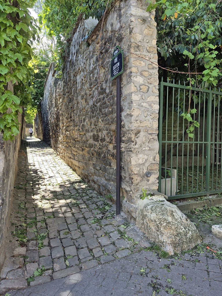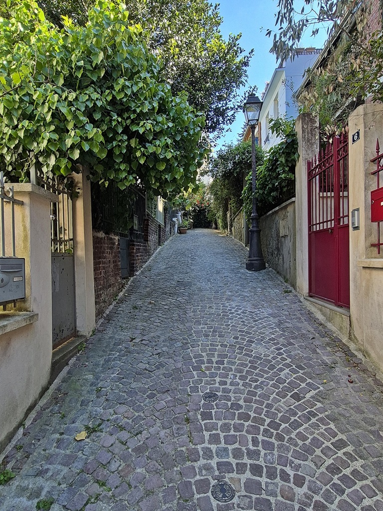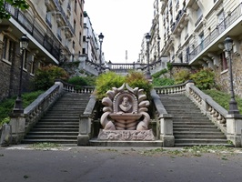 Ich schlenderte noch ein wenig über das Gelände des ehemaligen Schlachthofes und erreichte dann schnell den "Parc des Buttes-Chaumont". Von dort aus suchte ich das "Quartier de la Mouzaïa", verfranzte mich ein bisschen, erreichte dann aber über Treppen und kleinere Straßen das Viertel mit den schmalen, steilen Gassen und den kleinen Häuschen in üppig bunten Vorgärten.