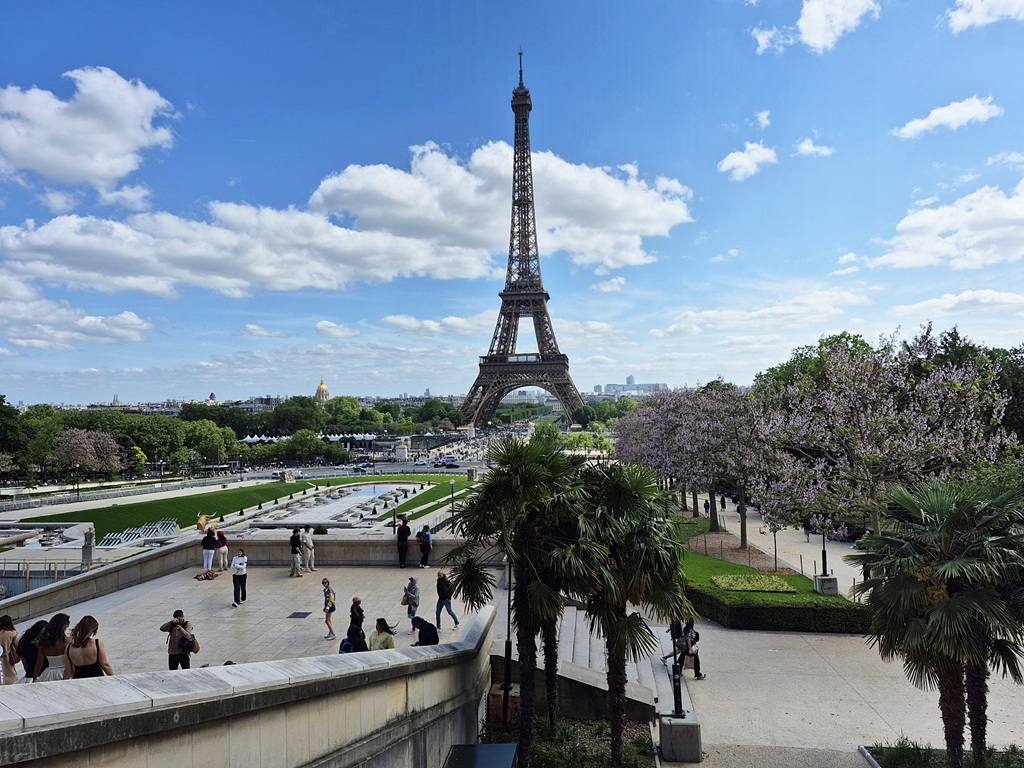 Von der Bushaltestelle direkt vor der Tür des Hotels fuhr ich quer durch die Stadt bis zum Eiffelturm, der rundherum gut eingezäunt ist. Über die Seine spazierte ich durch die Gartenanlagen zum "Trocadéro" mit dem spektakulären Blick auf den Turm.
