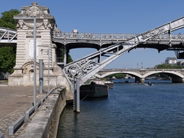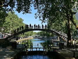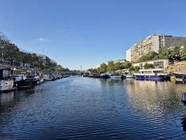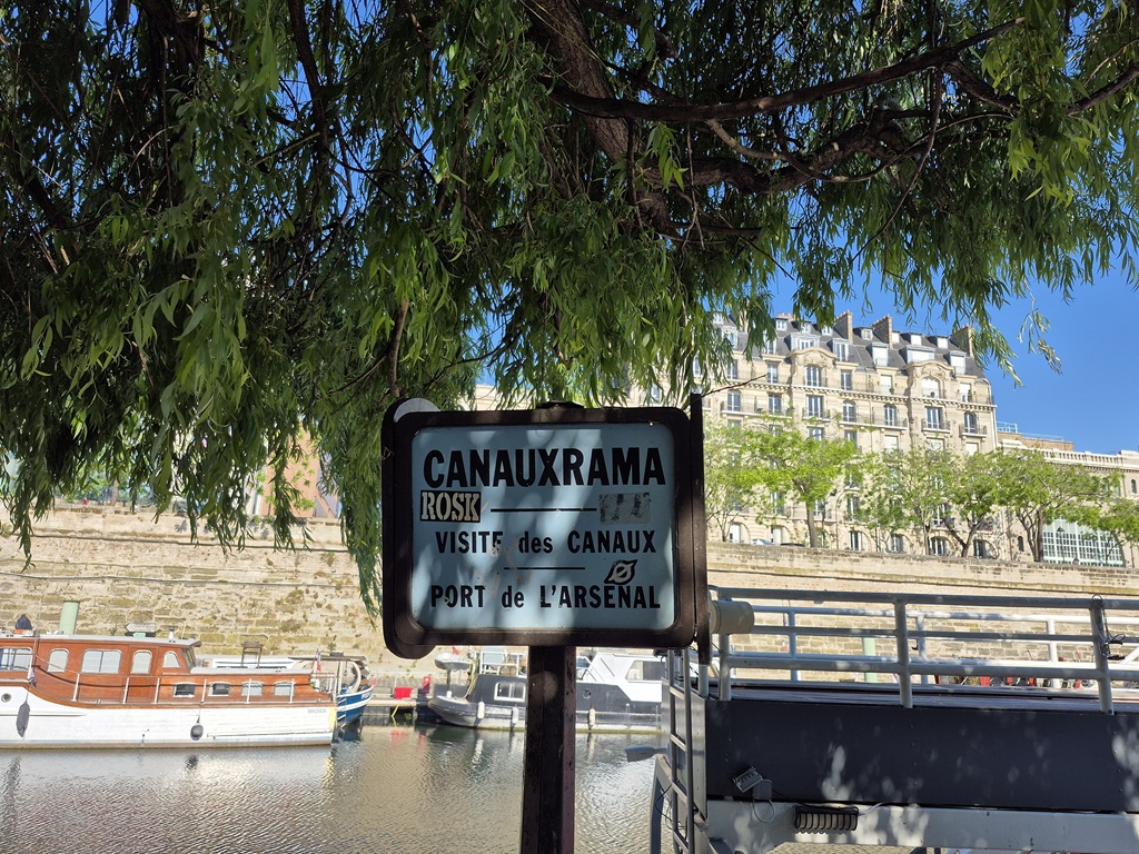 Die Kanalfahrt war nach einigem Hin & Her mit dem Reservierungsbüro auf Sonntagmorgen verschoben worden und so fand ich mich pünktlich am "Port d'Arsenal" ein. Mit ausführlichen Erläuterungen zum Kanal, zu den Gebäuden rechts und links des Ufers in Französisch und Englisch schipperten wir zunächst unter der Abdeckung zwischen den beiden Straßenzügen des Boulevard Richard-Lenoir her. Dann ging es bei tollem Wetter aber oberirdisch weiter. Wir durchfuhren 5 Schleusen, passierten 2 Drehbrücken. Überall standen winkende Menschen auf den Brücken und an den Ufern. Wir kreuzten das "Bassin de Villette" und fuhren noch ein Stück auf dem "Canal de l’Ourcq" bis kurz vor den "Boulevard Périphérique". Am Kai des Bootstourenunternehmens stiegen wir aus.