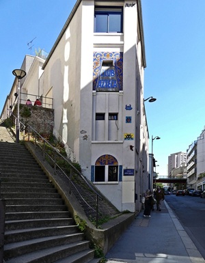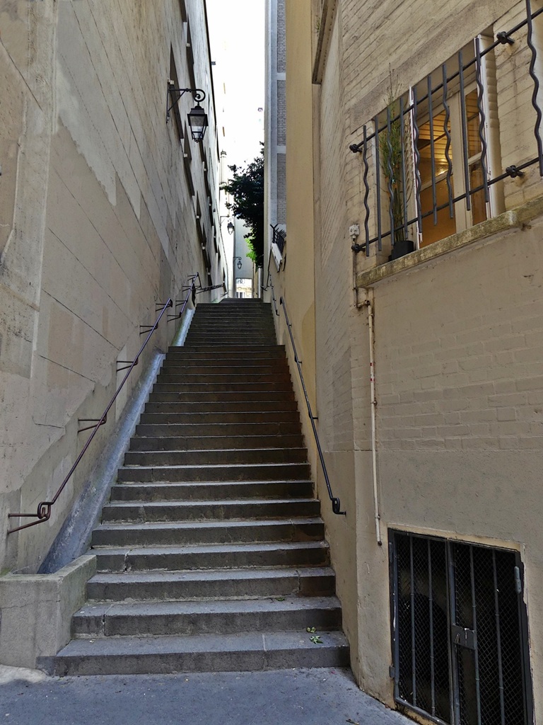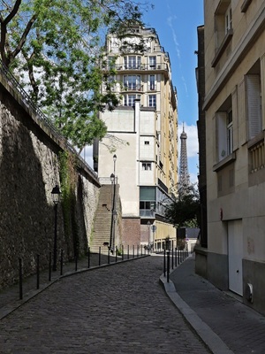 Ich schlenderte noch ein wenig über das Gelände des ehemaligen Schlachthofes und erreichte dann schnell den "Parc des Buttes-Chaumont". Von dort aus suchte ich das "Quartier de la Mouzaïa", verfranzte mich ein bisschen, erreichte dann aber über Treppen und kleinere Straßen das Viertel mit den schmalen, steilen Gassen und den kleinen Häuschen in üppig bunten Vorgärten.