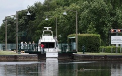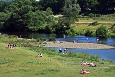 Entweder geht es durch die Parkanlagen gegenüber der Schiffsanlegestelle, vorbei an der ehemaligen Thyssen-Villa, bis zum Wehr.